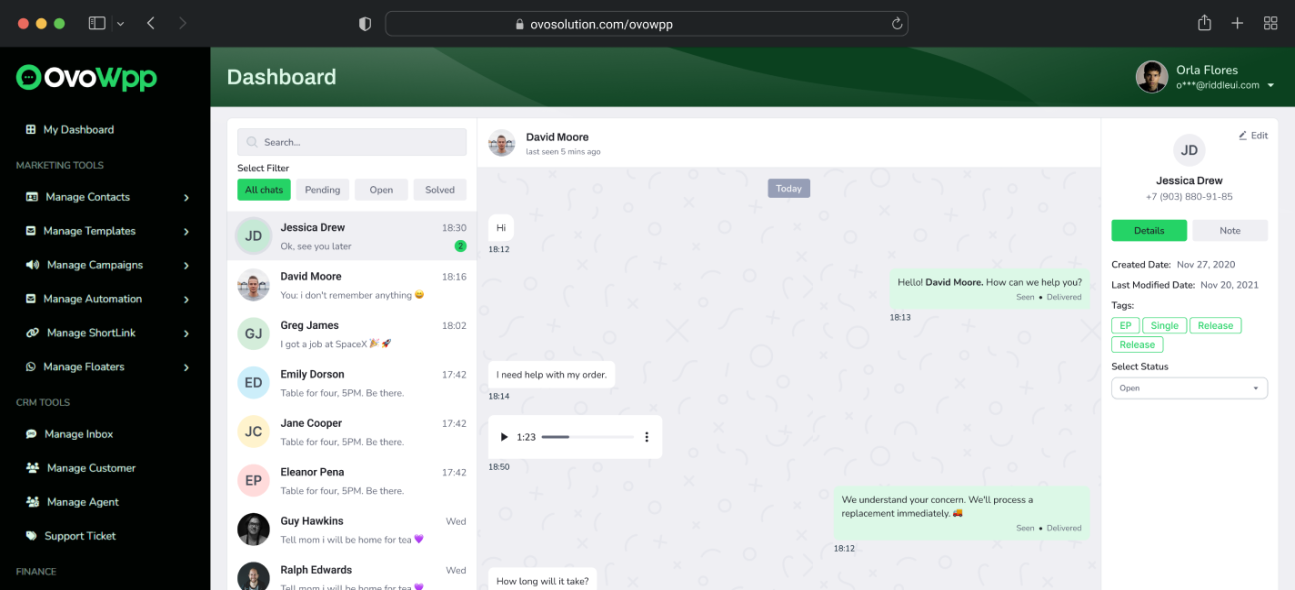 OvoWpp is a complete cross-platform WhatsApp CRM and marketing tool that helps businesses manage conversations, automate customer engagement, and run marketing campaigns through WhatsApp.